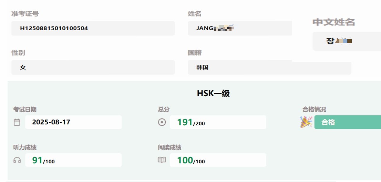 초등3학년 장**학생 HSK1급 합격 축하드려요