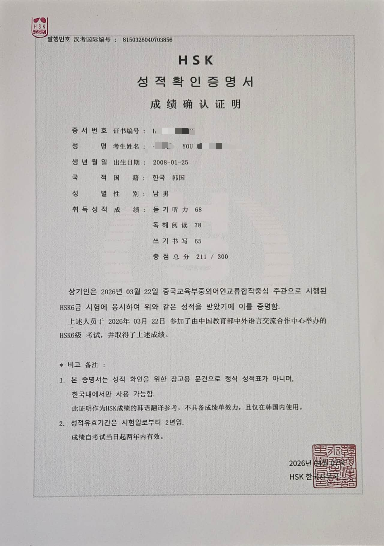 HSK6급 합격 축하드립니다